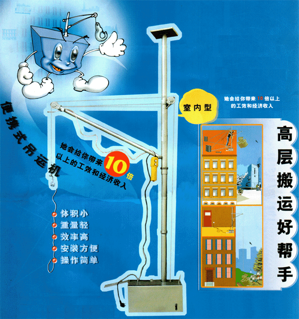 便攜式小吊機(jī)是誕生于世紀(jì)之初的新產(chǎn)品,它體積小、重量輕,一個(gè)人自行車就能攜帶;它吊的高、速度快,30層樓房8分鐘就能打來回;它便于安裝、起重大、容易操作、效率高;它投資小、見效快、零風(fēng)險(xiǎn)、高回報(bào)它的問世是當(dāng)今建筑裝潢行業(yè)機(jī)械運(yùn)料的重大突破,從此將結(jié)束高空裝潢材料依靠人工搬運(yùn)的歷史。它極大地減輕了勞動強(qiáng)度,最大地創(chuàng)造了經(jīng)濟(jì)效益。