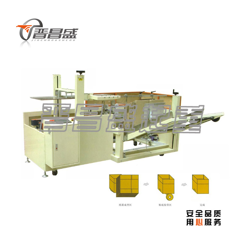 自動(dòng)完成開(kāi)箱、成形、下底折葉折曲。并現(xiàn)時(shí)完成下部分膠帶粘貼,將疊成紙板的箱板自動(dòng)打開(kāi),箱子底部按一定程序折合,并用膠帶密封后輸送給裝箱機(jī)的專用設(shè)備。